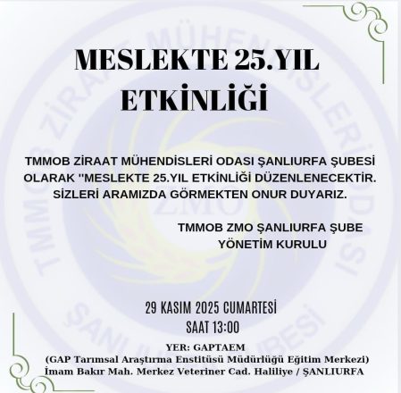 TMMOB Ziraat Mühendisleri Odası (ZMO) Şanlıurfa Şubesi, meslekte çeyrek asrı geride bırakan üyelerine yönelik anlamlı bir buluşma gerçekleştirmeye hazırlanıyor. Şube yönetimi tarafından düzenlenecek olan “Meslekte 25. Yıl Etkinliği”, ziraat mühendisliği mesleğine uzun yıllar emek veren mühendisleri bir araya getirmeyi amaçlıyor.